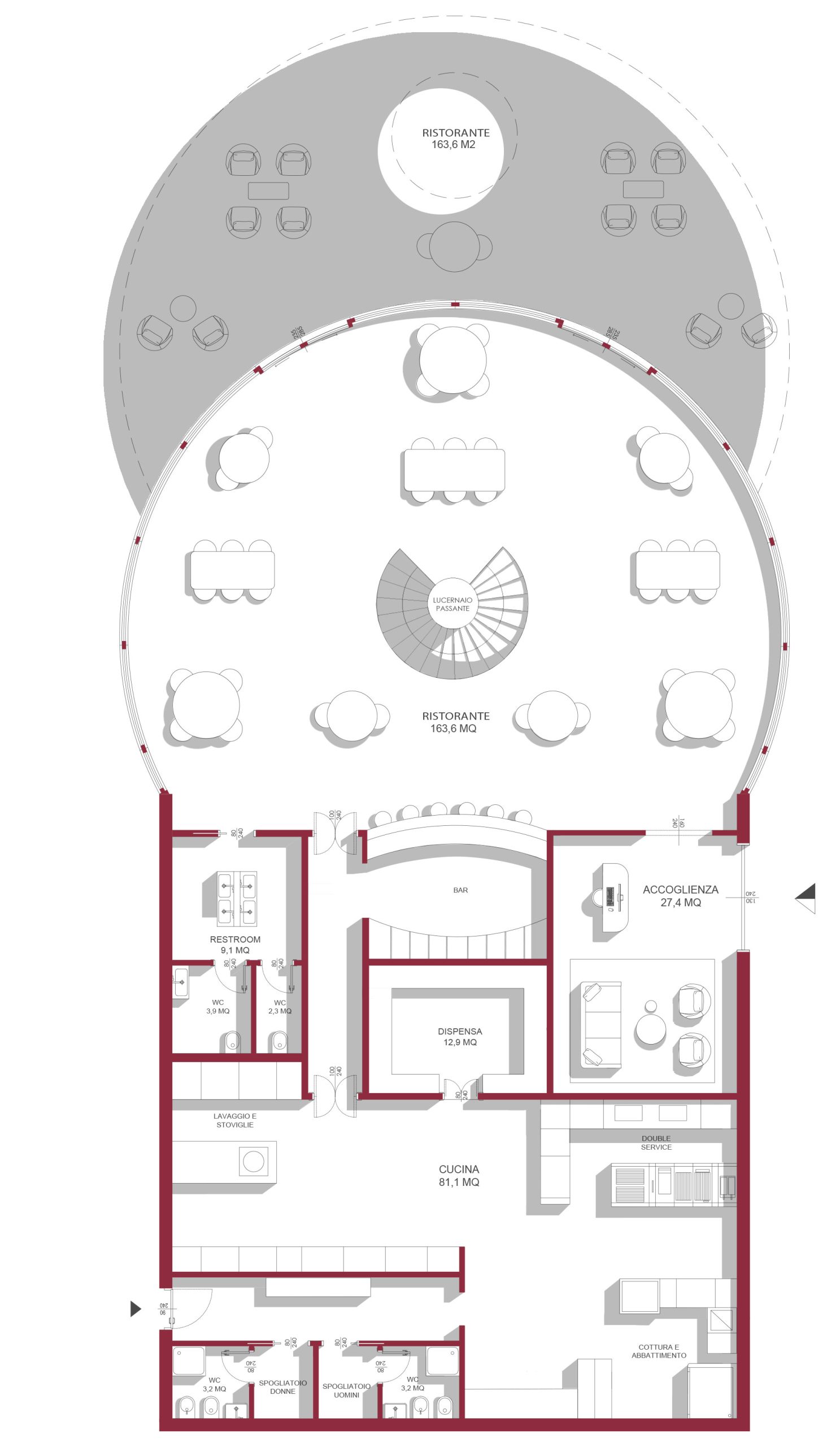 Il Club Bistrot è il fulcro del progetto: un ambiente che accoglie gli ospiti fin dall’ingresso con una reception elegante e funzionale. La sala principale, dalla forma rotonda e avvolta da un’ampia vetrata panoramica, ospita il ristorante, concepito come bistrot esclusivo immerso nel paesaggio.