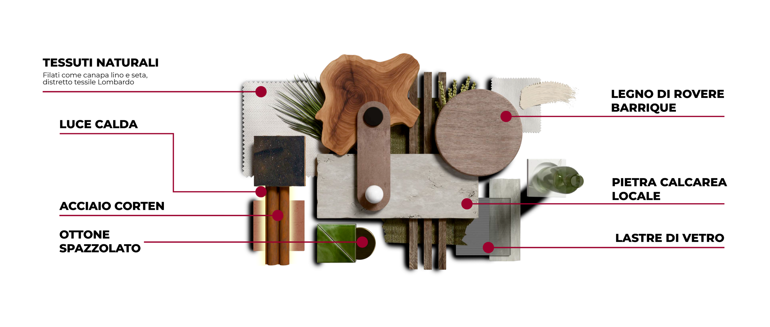 Questa selezione materica esprime un linguaggio architettonico essenziale e in armonia con il paesaggio. I materiali naturali e locali – come legno, pietra, intonaci a calce e tessuti grezzi – sono scelti non solo per il loro valore tattile e la capacità di dialogare con l’ambiente circostante, ma anche per garantire sostenibilità e ridotto impatto ambientale. L’impiego di risorse locali riduce i trasporti, valorizza le maestranze artigiane e sostiene l’economia del territorio. In questo modo, il progetto diventa parte attiva della comunità, generando benefici ambientali, sociali ed economici, e fondendo tradizione e contemporaneità in un’unica esperienza